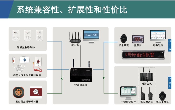 多嘴猫无线智能输液通知系统的通讯组网设备、移动接收设备和固定显示设备等可以与病房呼叫、卫生间紧急求助、科室一键报警系统兼容共用,节省投入,一网多用,全部采用无线通信,不用布线和现场施工,调试安装时间短,节省时间,不影响医院的正常工作,系统可随时扩展,并能迅速投入使用。